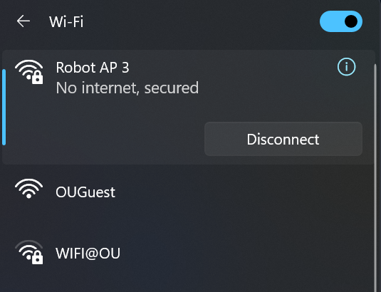 Connect to the network named “Robot AP robot number” (Example: Robot AP 3)