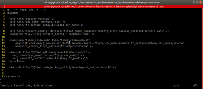 With your text editor of choice, open sensors.launch located in …/mushr_hardware/launch/racecar-uw-nano/: